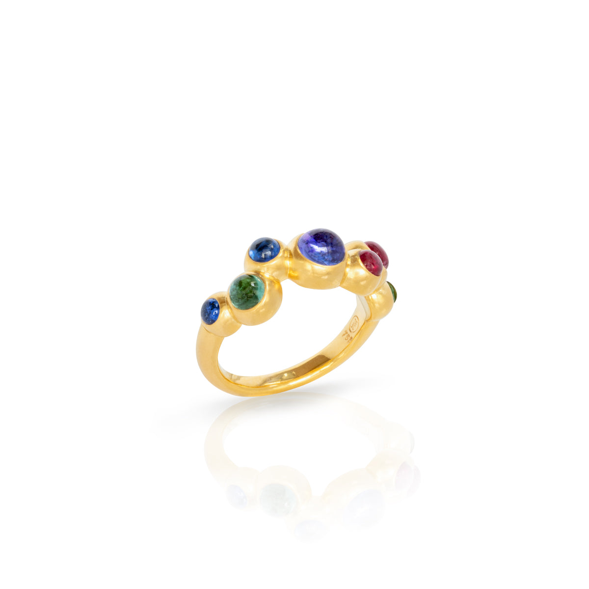 Ring 750 Gelbgold mit Tansanit, Turmalin und Saphiren im Cabochon Schliff