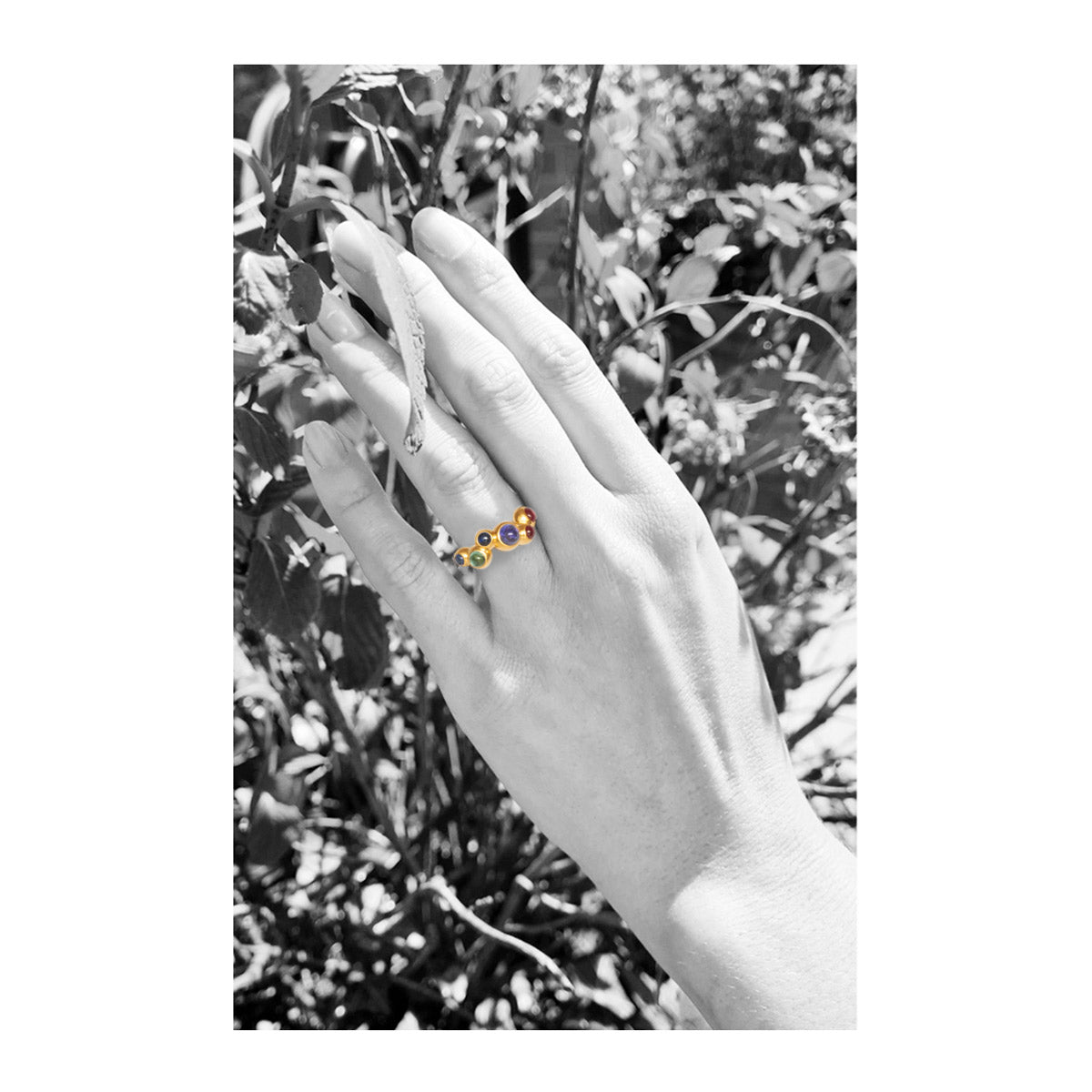 Bei diesem außergewöhnlichen Ring tanzen die leuchtenden Edelsteine förmlich aus der Reihe.