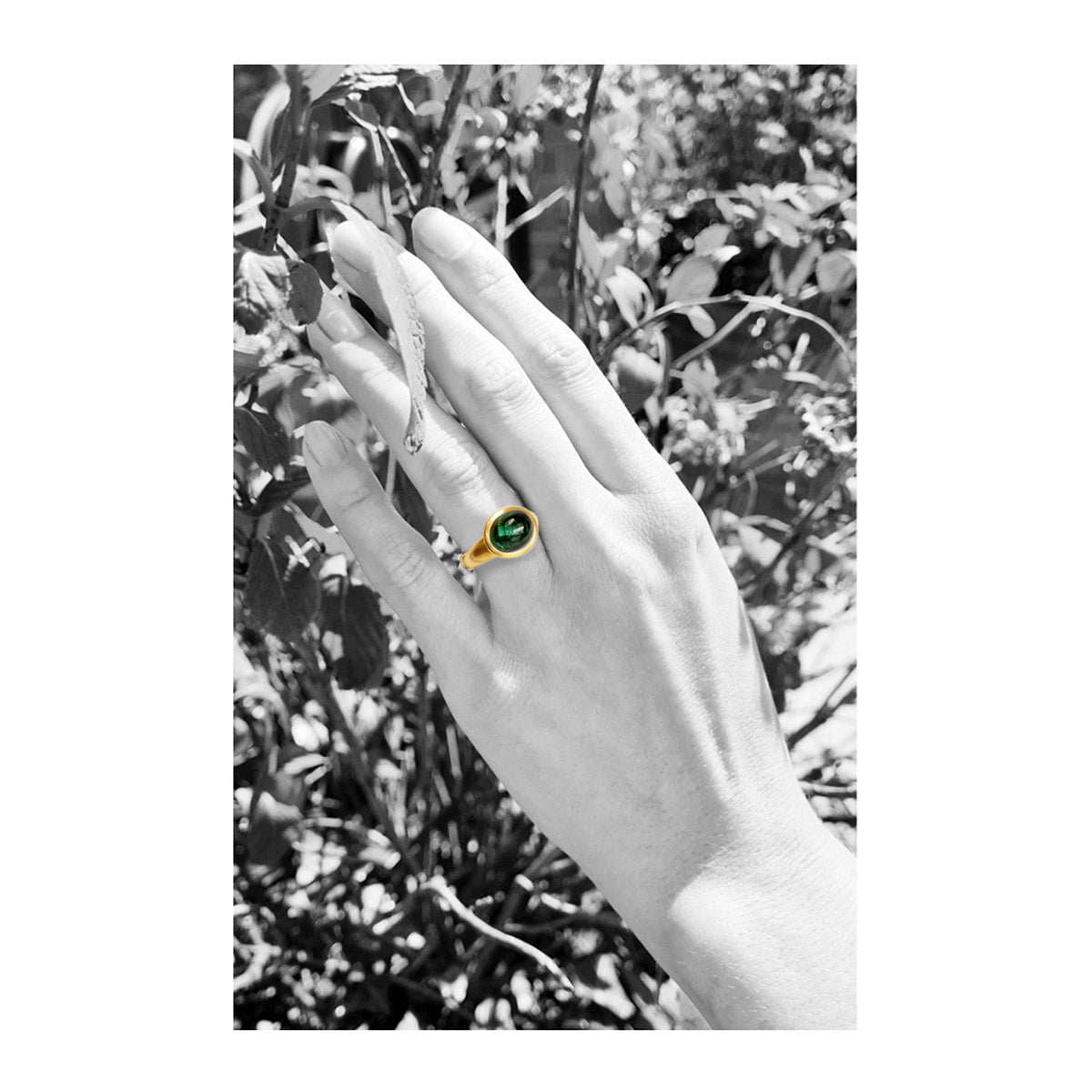 Die puristische, abgerundete Fassung bildet den perfekten Rahmen für den Edelstein im Cabochon-Schliff, hier ein grüner Turmalin, der quer zum Finger gefasst ist.